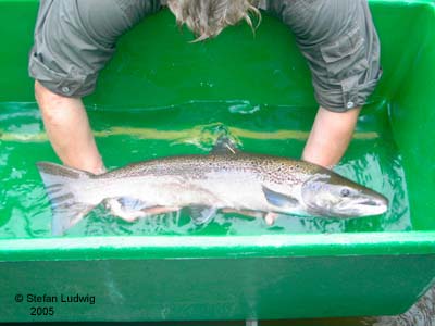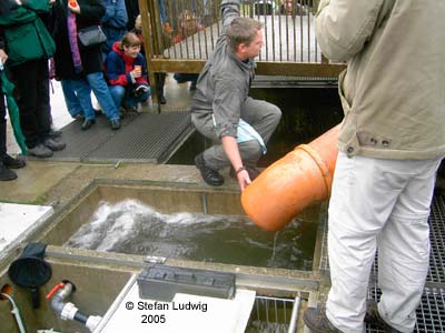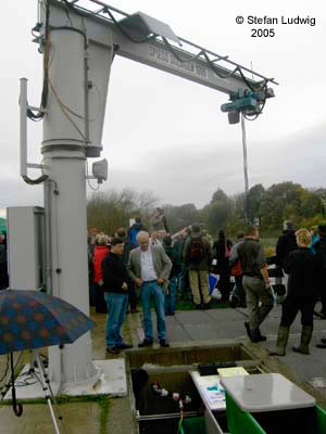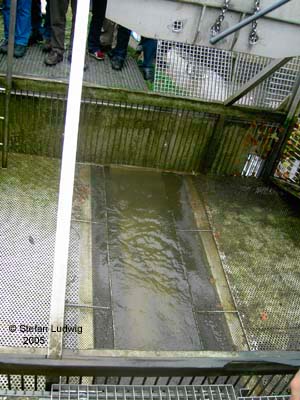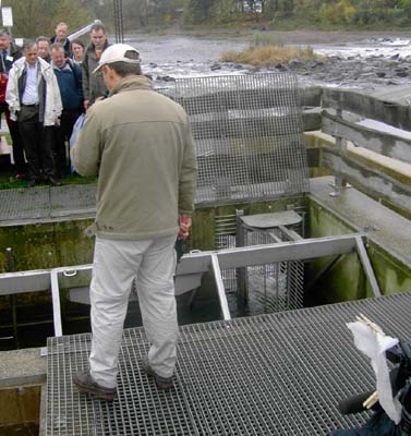 Persönliche Anmerkung 04.11.2005 : Die Kontrollstation in Buisdorf ist für Monitoringzwecke beim Fischaufstieg sehr gut ausgestattet. Die Fische werden keilförmig auf die Fangreuse zugeleitet. Der Fang wird mittels eines Kranes geborgen wobei etwas Restwasser in einer tiefer liegenden Reusenkehle die Fische in ihrem Element belässt. Mittels Rohrdurchlass wird der Fang in ein Betäubungsbecken geleitet und leicht betäubt. Bis zu dieser Station wurden die Fische noch nicht von Händen berührt. Aus dem Betäubungsbecken werden die betäubten Fische dann mit einem feinmaschigen Netz gefangen, beprobt (Genanalyse) und markiert und in ein Becken mit Frischwasser zur Betäubungsaufhebung gelegt. Foto unten : Armin Nemitz erklärt die Funktion der Fanganlage kurz bevor die Reuse mit dem Kran gehoben wird.