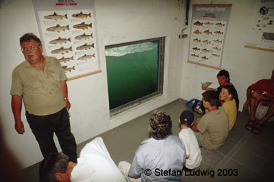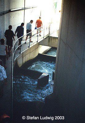 ![]() Weiterhin gibt es zwei Beobachtungsräume die einen Einblick in den Fischpass ermöglich. Einer davon ist den Besuchern zugänglich. Der zweite. dient wissenschaftlichen Zwecken und ist mit einer Videoüberwachung ausgestattet.