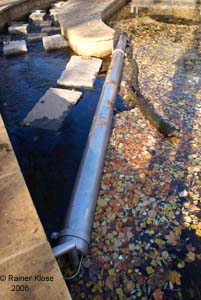 gut gelöst : am oberen Auslauf hält ein mit dem Wasserstand bewegliches Rohr