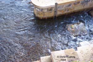 ![]() Der Fischpass erzeugt bei dem niedrigem Wasserstand eine gute Lockströmung. Der untere Einstieg ist durch hinab gespülte Kiesel schon sehr flach - bei Hochwasser wird sich diese Flachzone wahrscheinlich noch erhöhen.