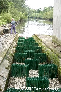 Anmerkung von H.- J. Sauer am 14.11.02 : Fischaufstieg von Döbel, Rotaugen und Forellen wurden beobachtet. Planungen : Umgebaut im Mai 2002 zu einem Kanu- Fisch- (Besen)- Paß. Ab dem 4. April 2003 bis 14.6.2003 wurde eine stationäre Fangreuse eingesetzt. Eva Mosch von der AG Fischökologie von der TU Braunschweig führte die Funktionsüberprüfung im Auftrag des NLWK (Frau P.Siering) durch.